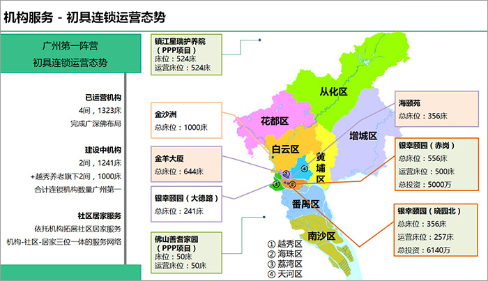 越秀银幸以点布局,运用标准体系管理,在国内已开7个项目,运营床位1323床,具备了连锁经营态势。公司提供居家、社区、机构养老一站式服务,也是广州首家社区嵌入式养老机构,并大力配合国家政策,为居民提供家庭式养老床位,解决居家养老难题。