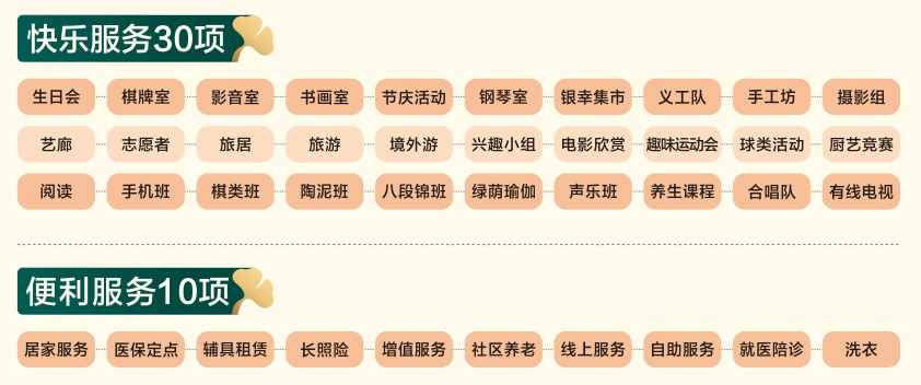 每个项目都搭配健康,快乐,便利服务。健康服务有中医门诊,康复计划,健康管理,医疗护理,专案照顾。快乐服务包括举办节庆活动,生日会,银幸学院和慰问演出。住在院区的长者能享受便利服务,如陪同就医,紧急呼叫,代购服务和爱心义检。