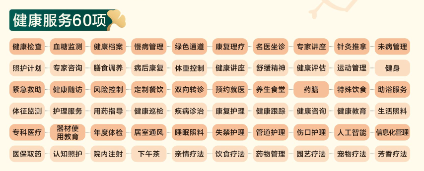 医疗护理服务:建立健康档案,每年常规体检,每月巡查房,每月举办健康讲座 保健指导;生活护理:房间打扫卫生,根据长者护理等级提供相应的起居照料。