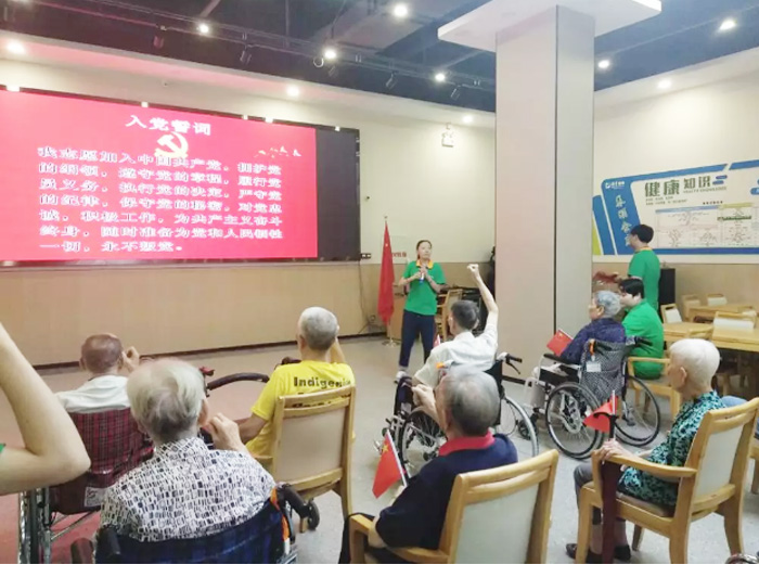 观看“厉害了,我的国”之前我们进行了入党宣誓仪式,长者都纷纷举起右手,在社工的领誓下完成了宣誓。