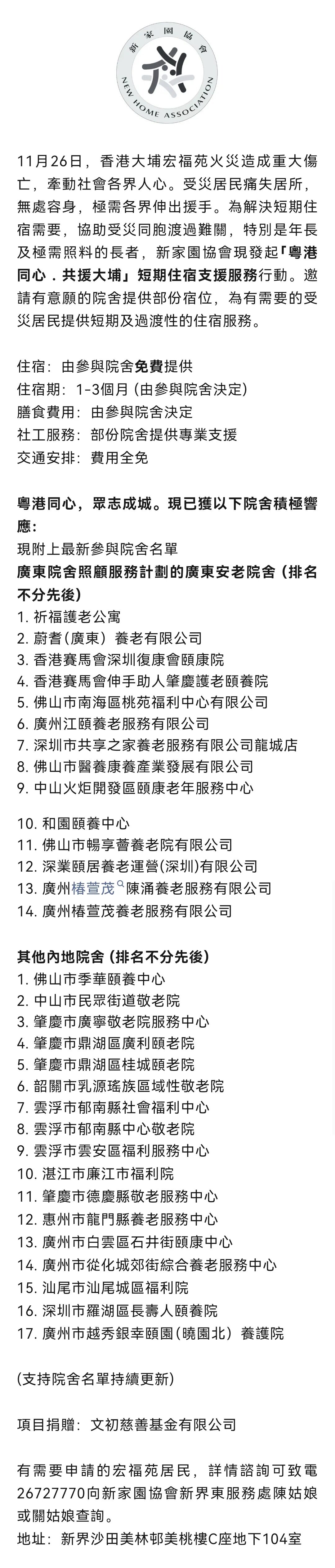 对于香港大埔宏福苑火灾造成的重大伤亡,我们深感痛心,此事牵动着社会各界的人心。越秀银幸积极响应社会号召,愿意提供旗下两家机构,接纳受灾居民,为他们提供为期一个月的免费住宿与日常餐食服务,备有临时安置床位10张。这两家机构分别是: